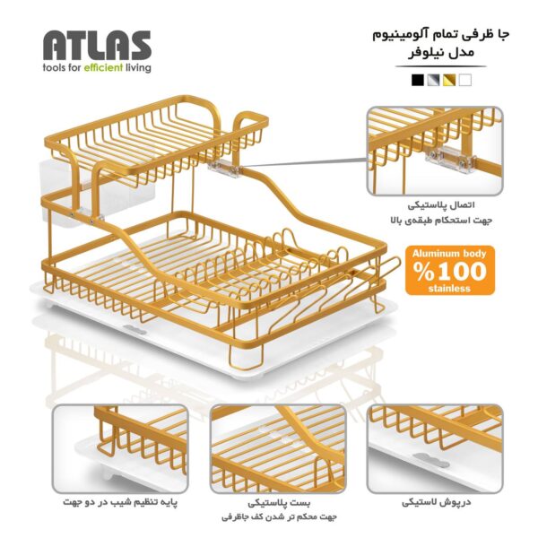 جاظرفی یک ونیم طبقه « پرتوبازار» از جنس آلومینیوم ساخت شده است. و با داشتن شیارهایی با سایزهای مختلف مناسب قرار گیری انواع بشقاب با سایزهای مختلف می باشد. همچنین میتوان انواع ظروف مختلف را در این جاظرفی منحصر به فرد و زیبا قرار دهید.
